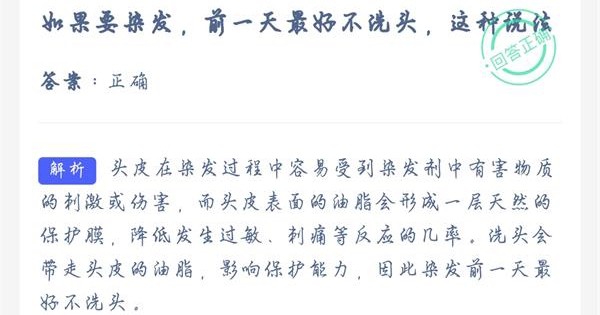 一般来说,理发师都会建议大家洗完头发隔两天再染头发的,这样对头皮以及对上色都会比较好,会让染出来的效果更好一些。今天蚂蚁庄园就是问大家,如果要染发,前一天最好不洗头,这种说法对吗?