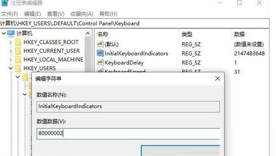 2、接着,在打开的注册表界面中,依次点击展开“HKEY_USERS\DEFAULT\Control Panel\Keyboard”,并双击打开“InitialKeyboardIndicators”,如图所示。