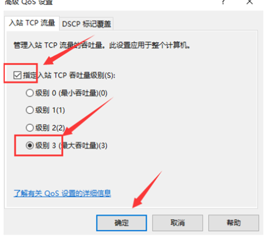 4、这时我们需要勾选指定入站TCP吞吐量级别,选择级别3再点击确定按钮。