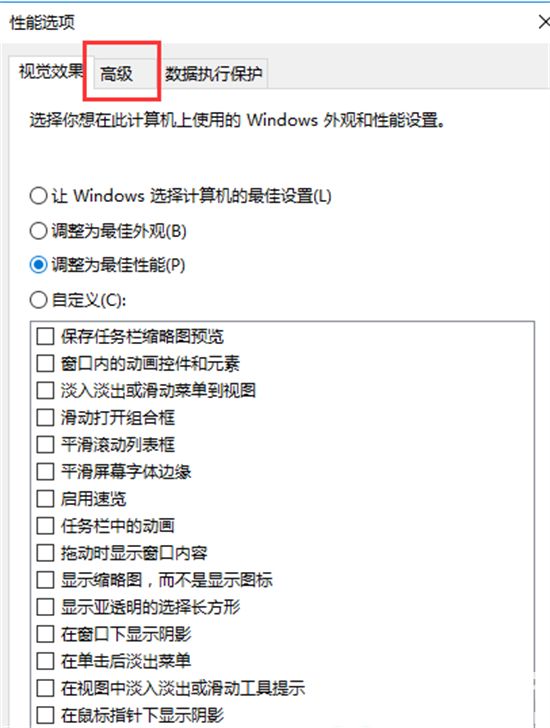 4、这次出现的是性能选项,左键点击高级选项卡。