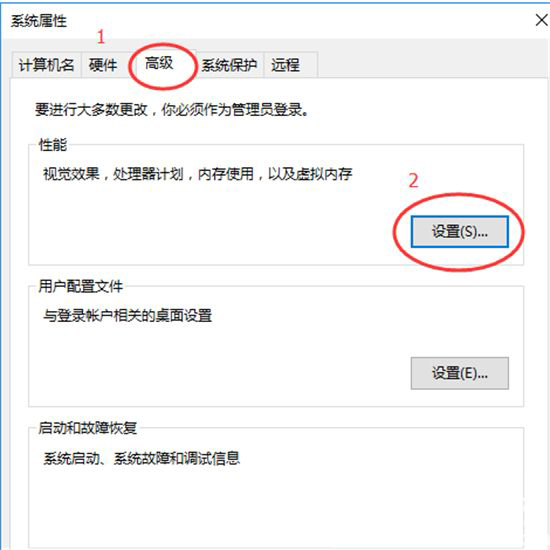 3、然后会弹出系统属性,先点击高级选项卡,再左键点击设置按钮。