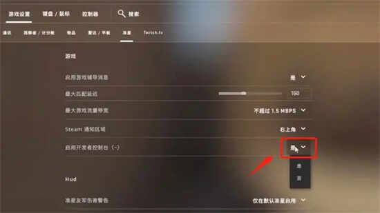 2、点击“游戏设置”,可以看到【启用开发者控制台(~)】这个功能选项;