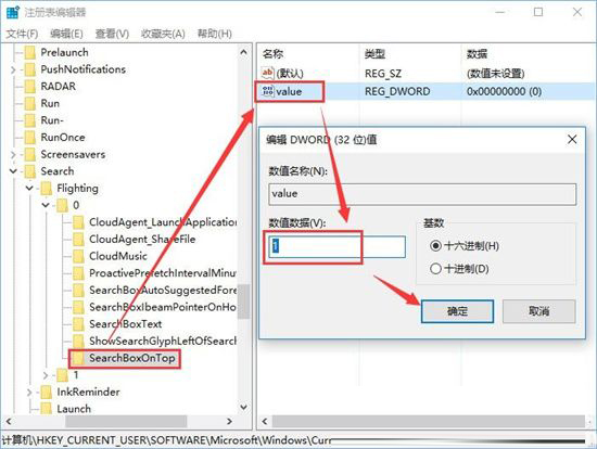 2、依次打开:HKEY_CURRENT_USER\Software\Microsoft\Windows\CurrentVersion\Search\Flighting\ 0\SearchBoxOnTop,然后找到并打开 value文件,然后将里面的数值数据改为1,如下图所示:
