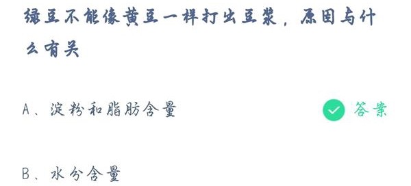 豆浆是我国人民早晨的餐桌上经常出现的早餐,喝豆浆对我们的身体有很多好处,豆浆的种类也有很多,但是大家一般都是使用黄豆打豆浆。今天蚂蚁庄园问大家的是,绿豆不能像黄豆一样打出豆浆,原因与什么有关?