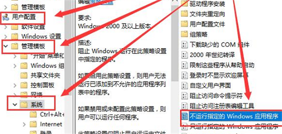2、在“用户配置”中依次展开:“管理模板”-“系统”,然后在右方找到“不运行指定的windows应用程序”。