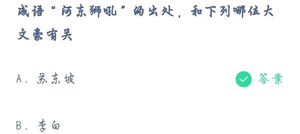 河东狮吼是一个比较有名的成语,一般形容家庭里女人比较剽悍,整天对自个男人大吼大叫,以河东狮吼为素材的影视作品都有不少。金蚂蚁庄园问大家的是,成语河东狮吼的出处和哪位大文豪有关?