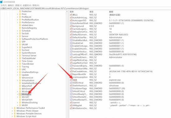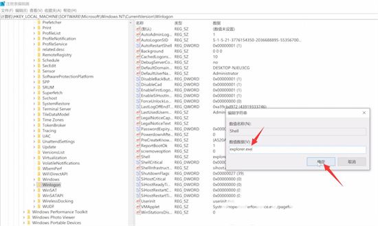 4、单击选中Winlogon,在右侧窗口中双击Shell,若Shell的数值数据为explorer.exe则正确,若不是,则更改为explorer.exe,点击确定即可。