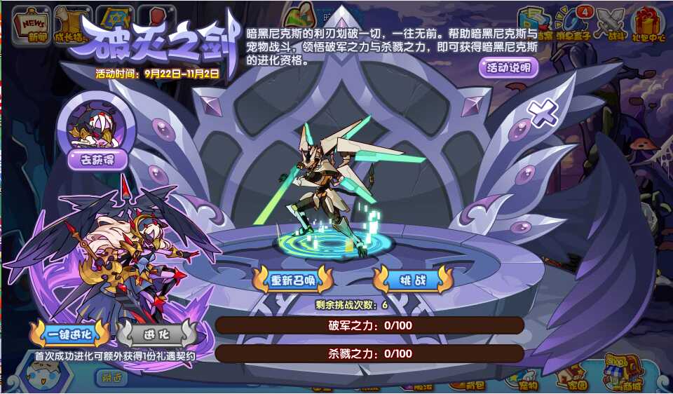 当破军之力与杀戮之力均满100点,就可以开启:暗黑尼克斯进化资格!