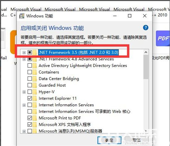 5、此时会弹出“Windows 功能”的窗口,在窗口中将“.NET WORK”相关的选项全部勾选起来,然后点击“确定”按钮就可以了。