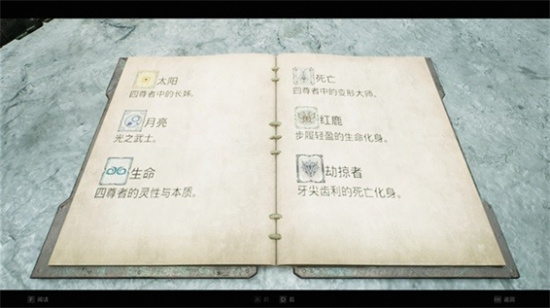 三角的直角尖朝左下角,按照顺时针顺序为劫掠者,生命,太阳,红鹿。