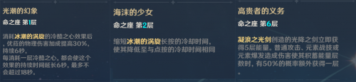 4.「命之座」1命对于优菈综合输出能力增幅非常大,2命优化了优菈的输出手法能让破甲减抗效果的维持更加稳定,4命有着非常不错的半血斩杀增伤机制,6命虽然抽取成本相对较高,但是能让优菈的光降之剑输出伤害获得极高的成长空间。普通玩家基本0命即可,强度党建议入手1命或2命,至于6命请旅行者们理性抽取。