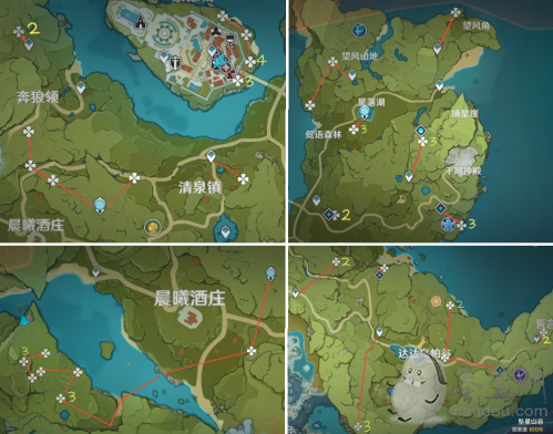 蒲公英籽目前的收集比较麻烦,路线如下,每个地图每次刷新至多采集53个。