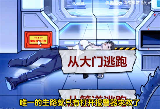 玩家们在面临选择的时候要选择都不要选择,因为你会发现左侧的大门有个警报接收开关,玩家们捡起船员腿旁边的遥控器就可以触发警报,这时候怪物会被声音吸引走,此时就可以选择钻入通风管道,就可以逃往救生舱了,这时候就可以过关了。