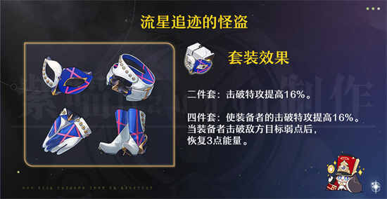 在副词条击破特攻无法达标时,建议优先选择将首饰更换为「盗贼公国塔利亚」(俗称盗贼套)二件套。如果还无法达标,再考虑将衣物套装更换为「流星追迹的怪盗」(俗称怪盗套)四件套。