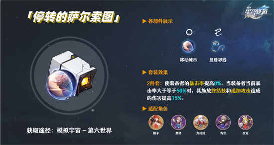 二件套:使装备者的暴击率提高8%,当装备者当前暴击率大于等于50%时,其施放终结技和追加攻击造成的伤害提高15%。