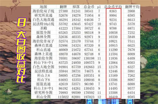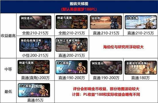 于是这里就出现了出入,有玩家统计了常规8大白图的搬砖收益,同样都是满疲劳搬砖英王难度,得出的结论是这样的:科涅恩山搬砖收益最高,可以达到300万以上(每次通关有近20万金币);其次是研究所和王之摇篮,大概收入在250-290万之间。