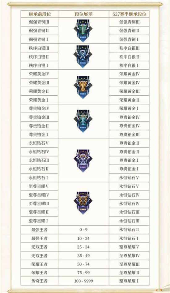 4、S34段位继承规则是:百星王者掉到星耀1,荣耀王者掉到星耀3,无双王者掉到星耀5,王者掉到钻石1,星耀会根据段位掉到铂钻石3到钻石5之间,钻石会根据段位掉到钻石5到铂金之间。