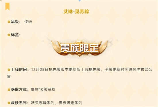 【艾琳-觅芳踪】标签是“贵族限定”,是V10贵族专属皮肤,也就是说,只有达到贵族10级才能获取。