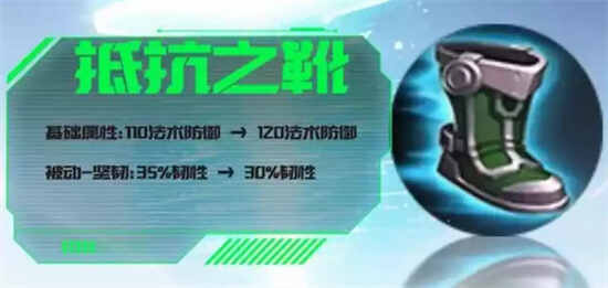 抵抗之靴,增加了10点法术防御,减少了5%的韧性加成。整体来说算是一波小削弱,因为法抗只需出点法抗装备很容易就能叠起来,韧性却很难叠。5%的韧性听着不多,可遇到控制多的阵容将会变得很致命。但是遇到多法伤的阵容,多了10点法抗的抵抗之靴依旧是首选。