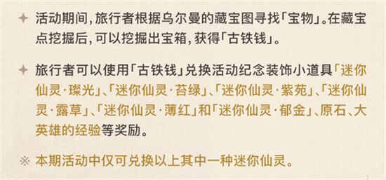 旅行者可以使用「古铁钱」兑换活动纪念装饰小道具「迷你仙灵·璨光]、「迷你仙灵·苔绿」、「迷你仙灵·紫苑」、「迷你仙灵·露草」、「迷你仙灵·薄红]和「迷你仙灵·郁金」、原石、大英雄的经验等奖励。