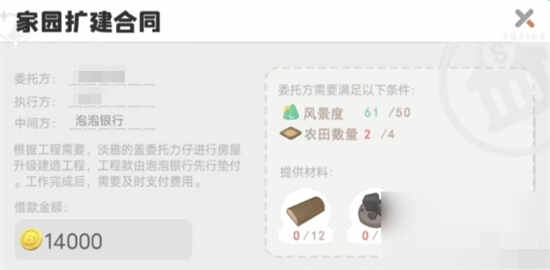 6、在我们点完扩建之后,茉莉会给我们一份家园扩建合同,我们需要攒齐合同上的材料才能进行扩建。