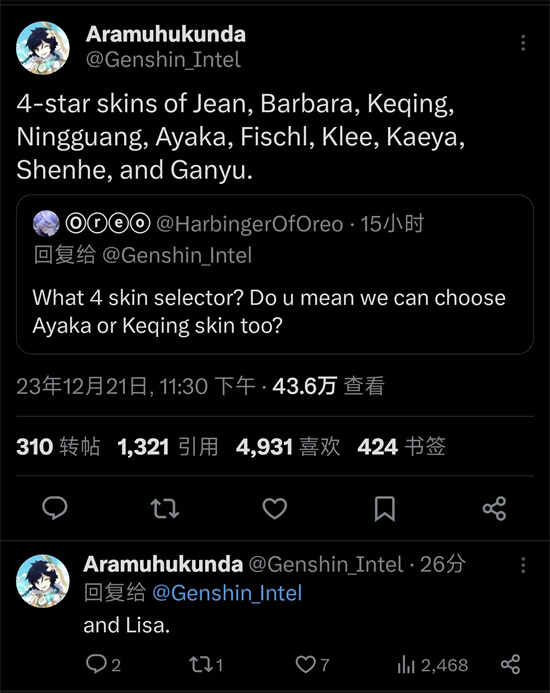 原神4.4自选4星皮肤有哪些