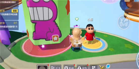 1、首先玩家打开游戏进入到游戏广场,在广场中找到蜡笔小新的位置,小新穿着红色的衣服很显眼。