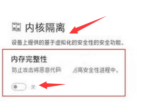 5、找到内核隔离选项,将内存完整性下方的按钮向左滑动关闭即可
