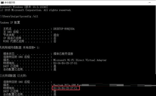 8、重新在命令窗口输入“ipconfig /all”回车,可以看到此时的mac地址已经改变,变成刚刚输入的“E0-26-B6-CB-37-C1”了。