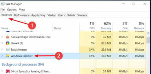 2、然后找到其中的资源管理器任务,右键选中它,将它“重新启动”一下就可以点击了。