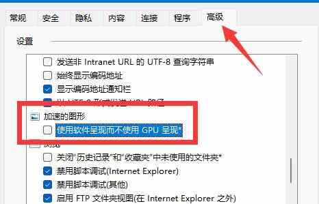 3、进入“高级”,取消“使用软件程序而不使用GPU呈现”并点击确定保存