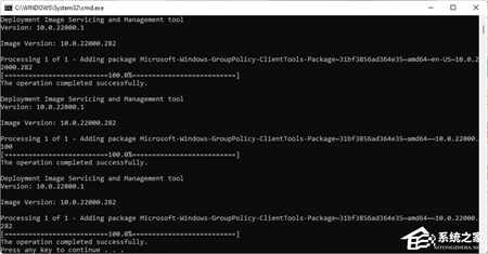 3、 应打开命令提示符窗口。这是 DISM 命令,它安装相关软件包以在您的计算机上启用 GPEDIT。等待该过程完成,可能需要几秒钟。当您看到“按任意键继续”的消息时,您就会知道它何时完成。