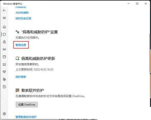 5、找到并点击“病毒和威胁防护”设置下的管理设置;