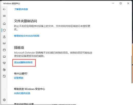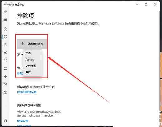 7、点击添加排除项(添加或删除要从 Microsoft Defender 防病毒扫描中排除的项目);