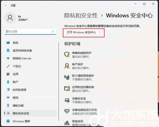 3、当前路径为:隐私和安全性 > Windows 安全中心,点击打开 Windows 安全中心;
