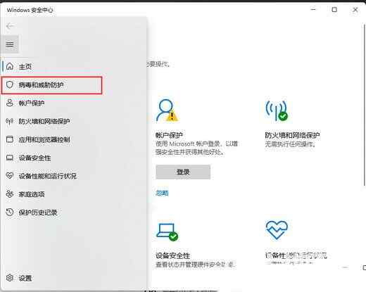 4、Windows 安全中心窗口,左侧边栏,点击病毒和威胁防护;
