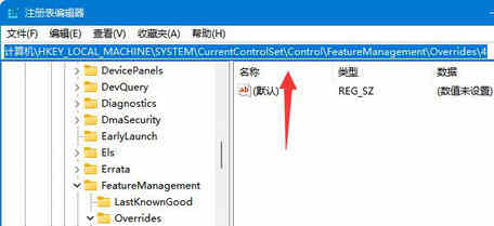 2、打开后进入“计算机\HKEY_LOCAL_MACHINE\SYSTEM\CurrentControlSet\Control\FeatureManagement\Overrides\4”位置