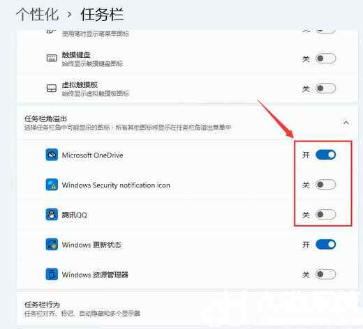 3、点击任务栏角溢出后,将将要显示的应用图标开关打开;