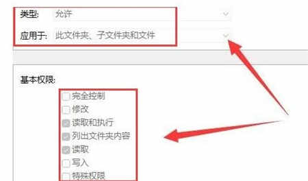 4、在打开的页面中,对于文件夹的访问权限类型改为允许,并且将下方的基本权限进行勾选,然后保存设置即可。