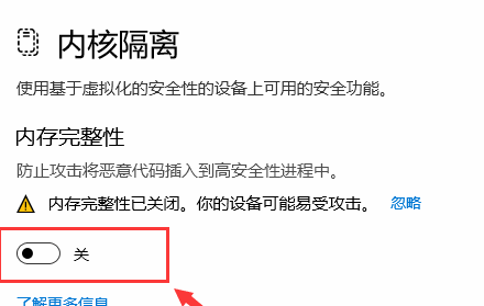 4、内核隔离下,滑动滑块,就可以将内存完整性关闭