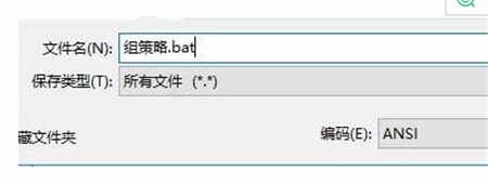2、接下来选择【文件】--【另存为】,【文件类型】选择【所有文件】,名称随意,扩展名为“.cmd”,如:组策略.bat 把它保存下来;