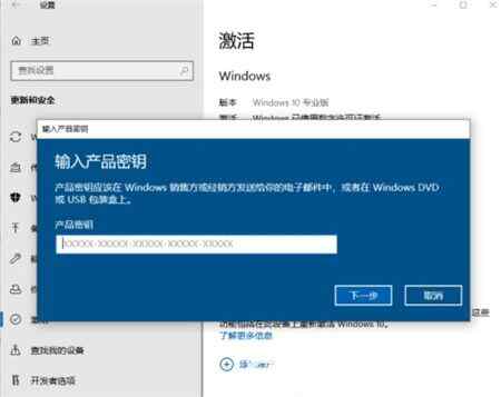 5、在产品密钥输入栏内输入Win10家庭版密钥,点击下一步按流程操作即可。