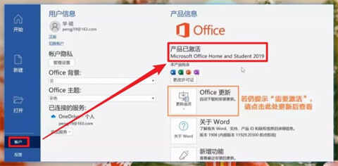 3、上述的操作都完成后,我们点击左下角的“账户”查看激活状态,如果显示需要激活,则再次点击“Office更新”,之后再检查一下是否搞定了!