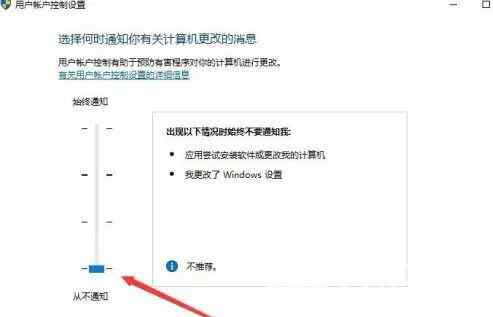 这时会打开用户帐户控制设置窗口,把滑块调整到最底部,然后点击确定按钮即可。重亲启动一次计算机后,再运行软件就不会提示扩展属性不一致的情况了。