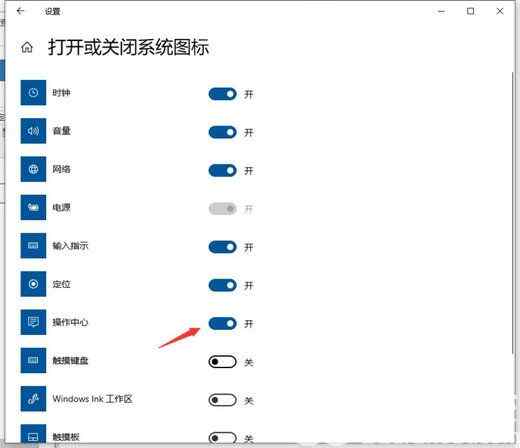 5、这里我们在系统图标的地方我们找到操作中心,后面的按钮我们设置为打开即可。