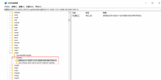 2、在注册表左侧显示框找到计算机\HKEY_CLASSES_ROOT\.mp4路径:计算机 \HKEY_CLASSES_ROOT\.mp4\ShellEx\{BB2E617C-0920-11D1-9A0B-00C04FC2D6C1}。