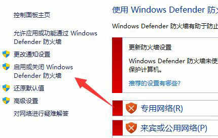 2、然后点击左边“启用或关闭Windows defender防火墙”