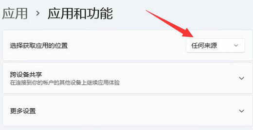 4、在其中修改选择获取应用的位置为“任何来源”即可。