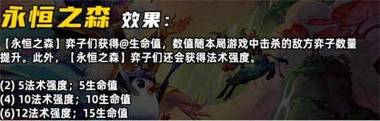 【永恒之森】弈子们获得生命值,数值随本局游戏中击杀的敌方弈子数量提升。此外,【永恒之森】弈子们还会获得法术强度。