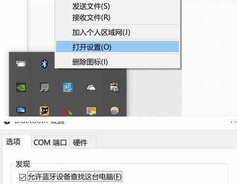 1、点击蓝牙图标,在弹出的对话框中选“允许蓝牙设备查找这台电脑”